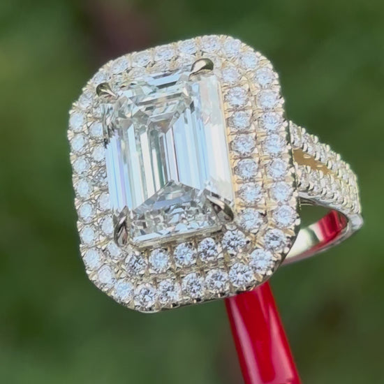 This breathtaking emerald-cut lab-grown diamond double row halo ring exemplifies refined luxury through clean lines and radiant brilliance. Anchored by a 4.96 – 5.10 carat emerald-cut center diamond, each stone is IGI certified and hand-selected for its superior D–F color and VS2–VVS1 clarity, showcasing crisp transparency and the unmistakable hall-of-mirrors effect unique to the emerald cut.